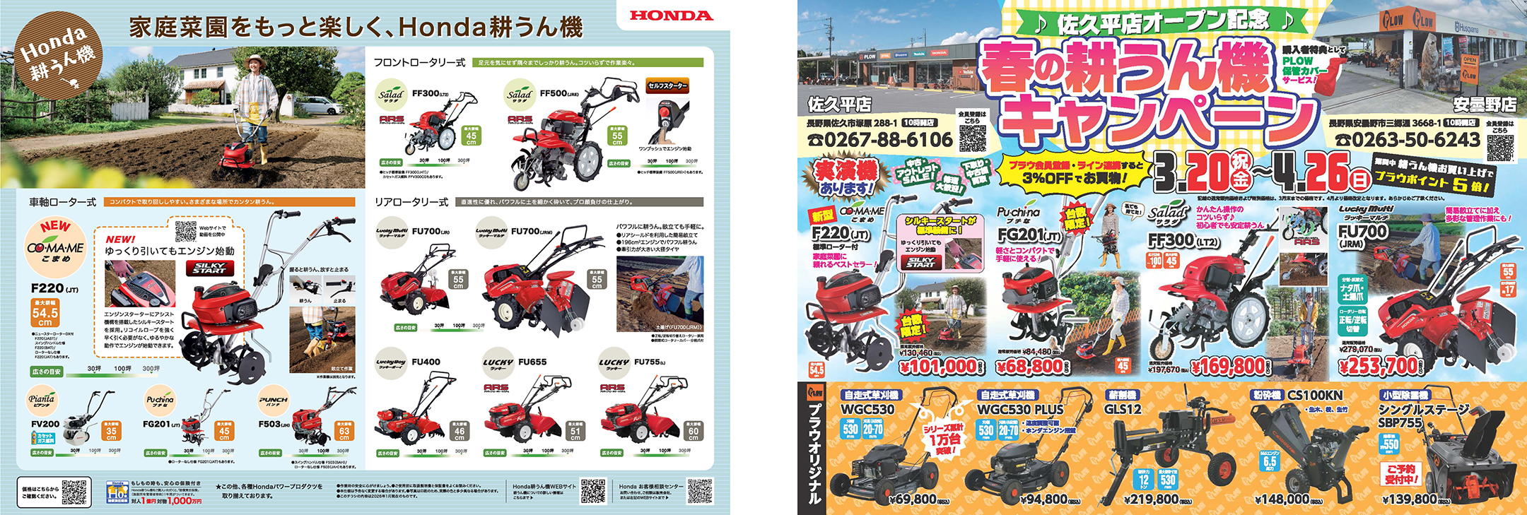 3/20|プラウ佐久平店・安曇野店「佐久平店オープン記念 春の耕運機キャンペーン」を開催します。(※安曇野店は3/13より先行スタート)