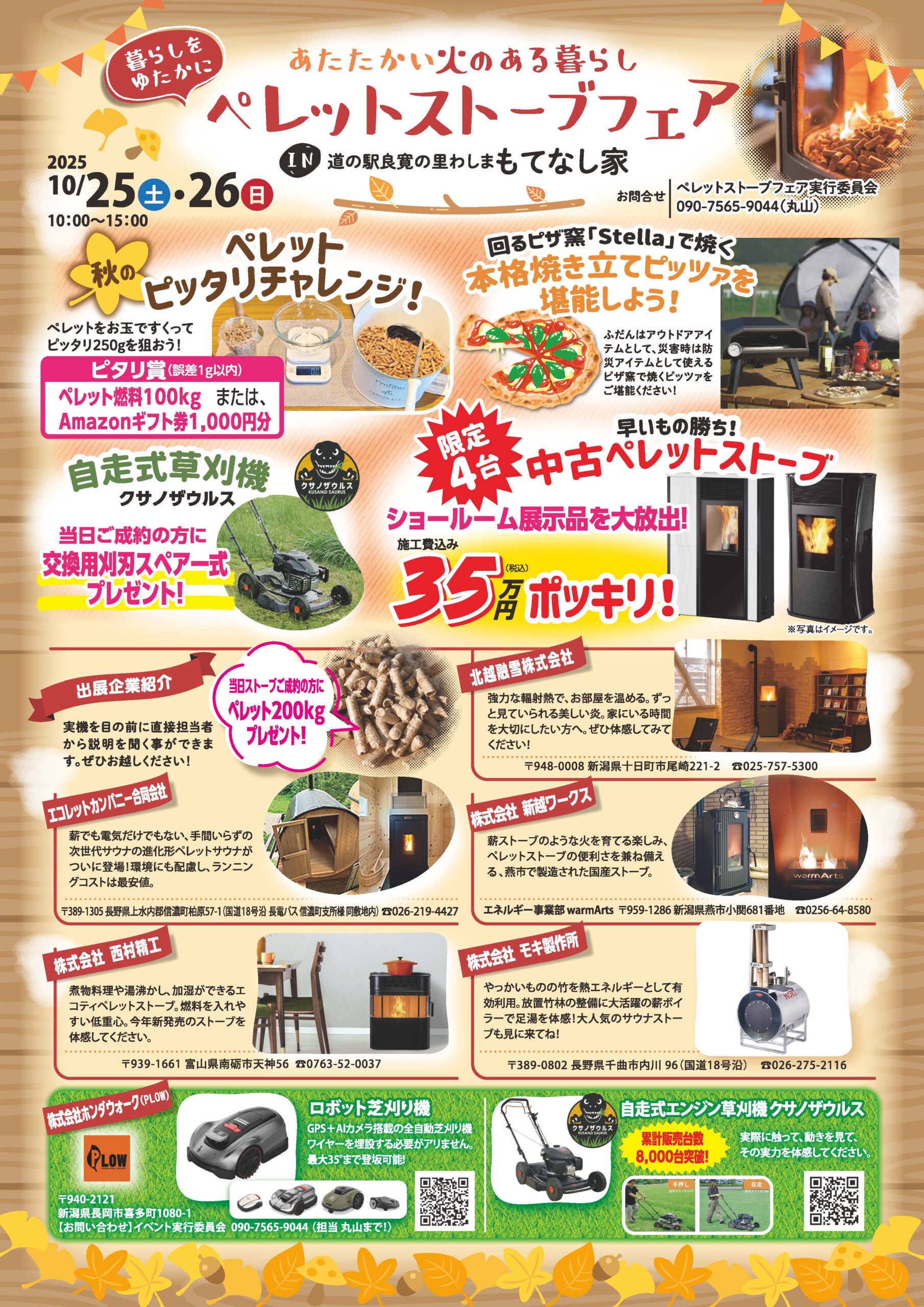 10月25日(土)26日(日)、プラウは道の駅良寛の里わしま もてなし家で開催される「ペレットストーブフェア」に参加します。会場では各社のペレットストーブが展示されるほか、ピザ窯で焼く本格ピッツァを味わえたり、豪華景品が当たるペレットすくいゲームなども楽しめます。