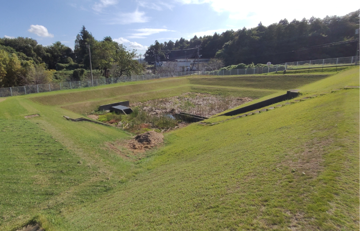 こちらでの施工課題は、貯水池へすり鉢状に下る斜面(傾斜角30〜33°)の存在。