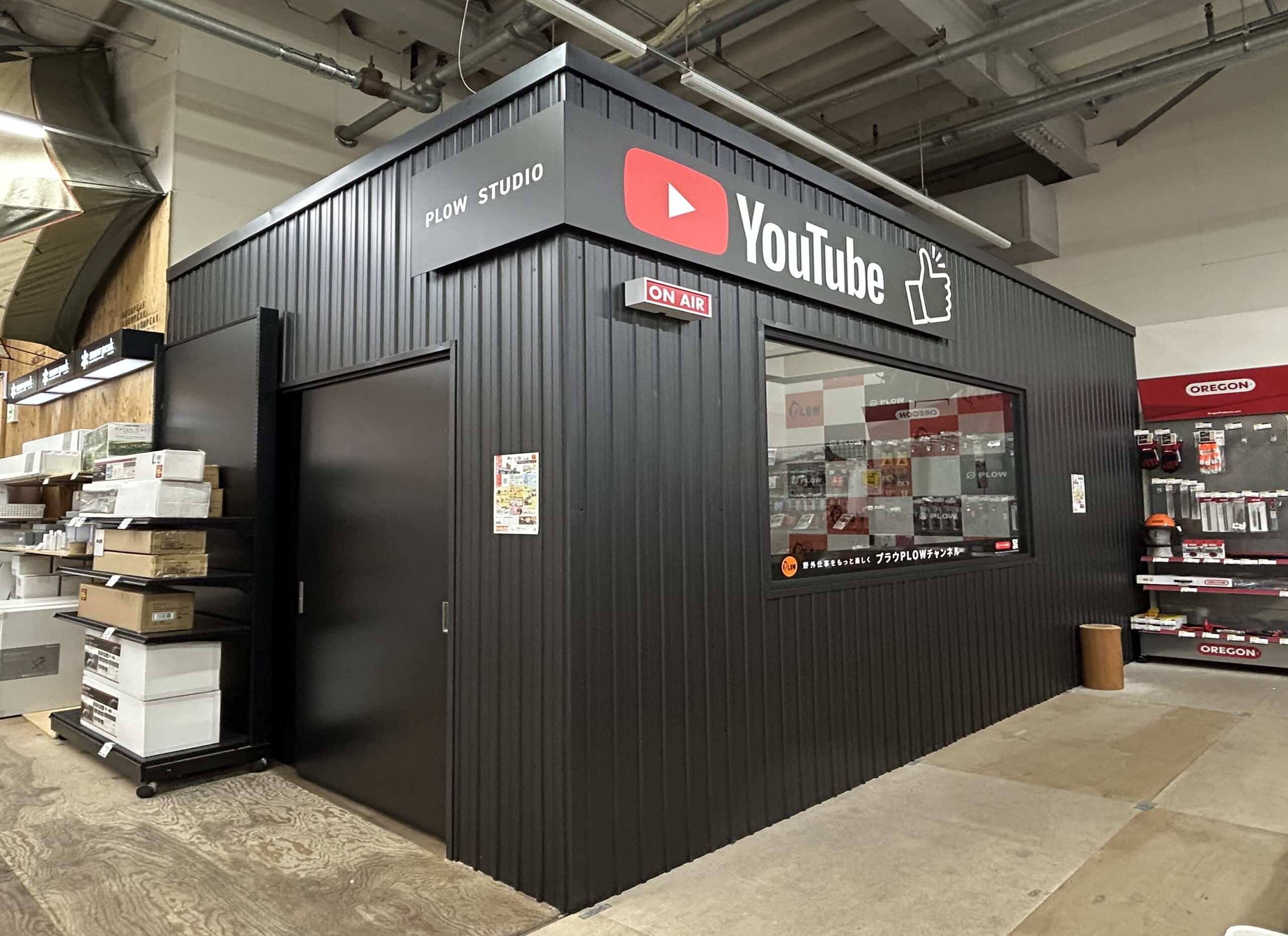 普段は動画撮影に使用しているスタジオが、この日は交流の舞台となります。プラウの薪割り機や草刈機が並ぶ広い店内で、イベントをお楽しみください。