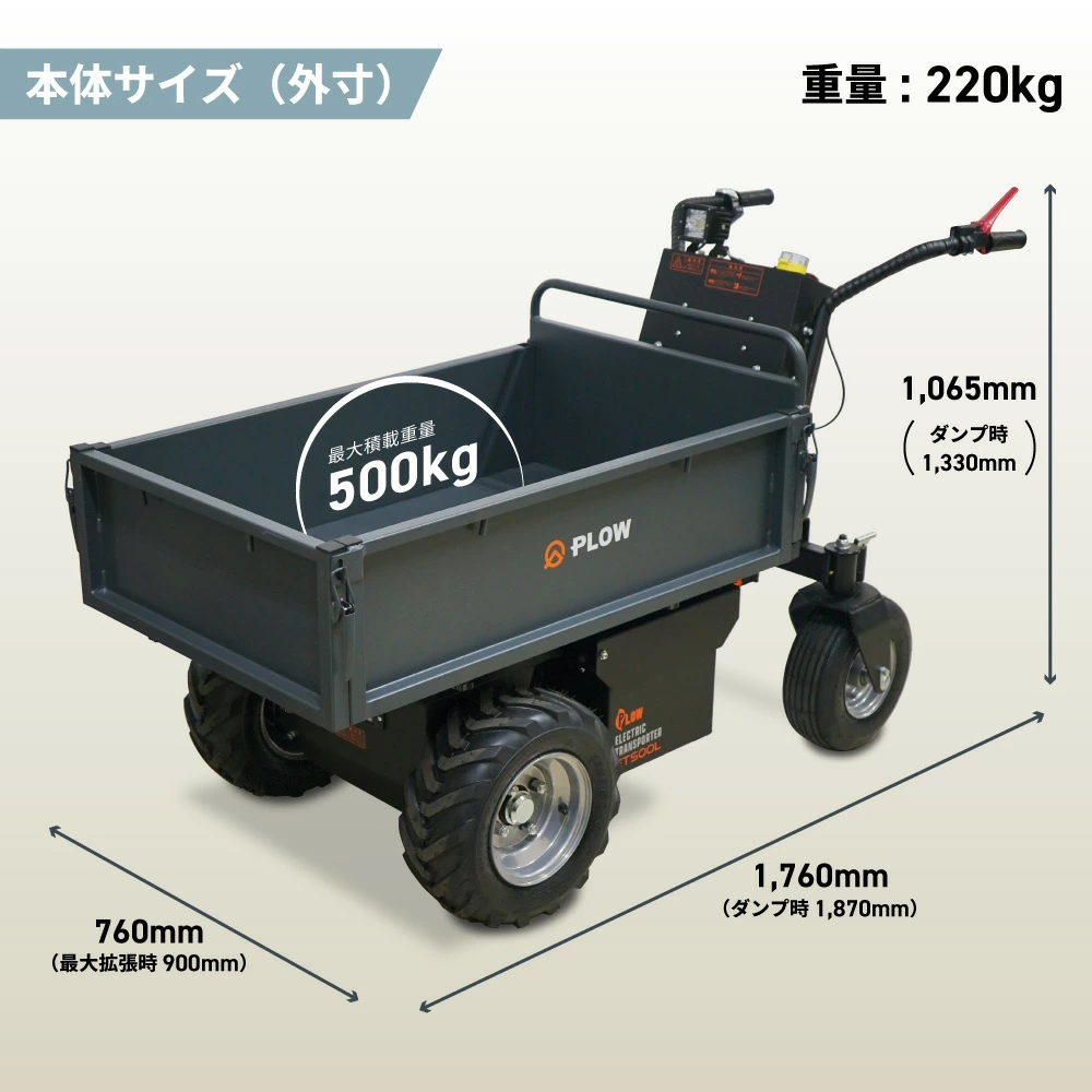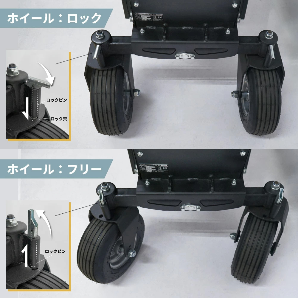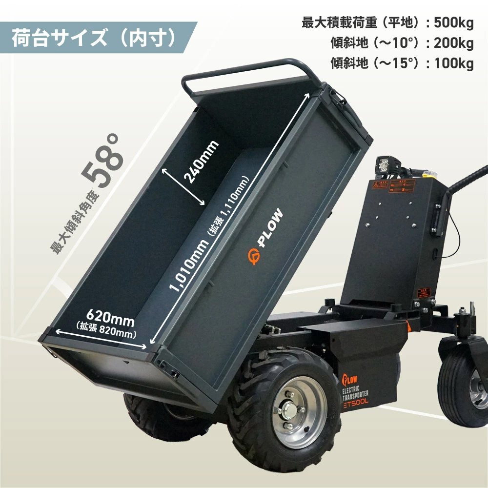 - ・1000WのブラシレスDCモーターを搭載し、平地で最大500kg、15度までの傾斜地でも100kgの荷物をパワフルに運搬可能