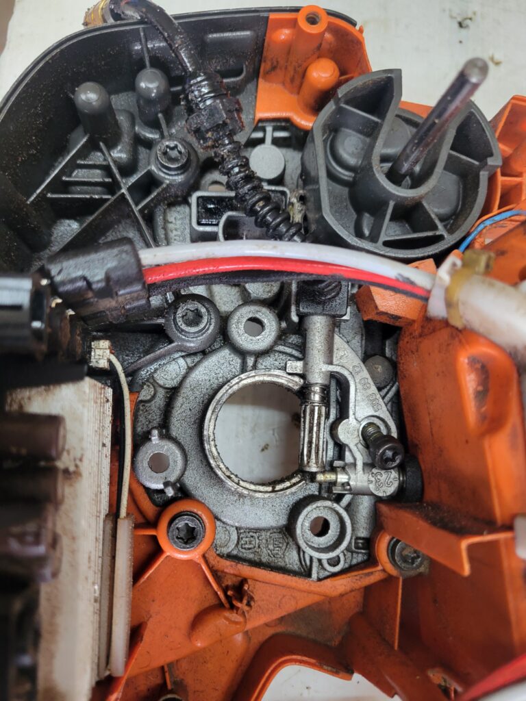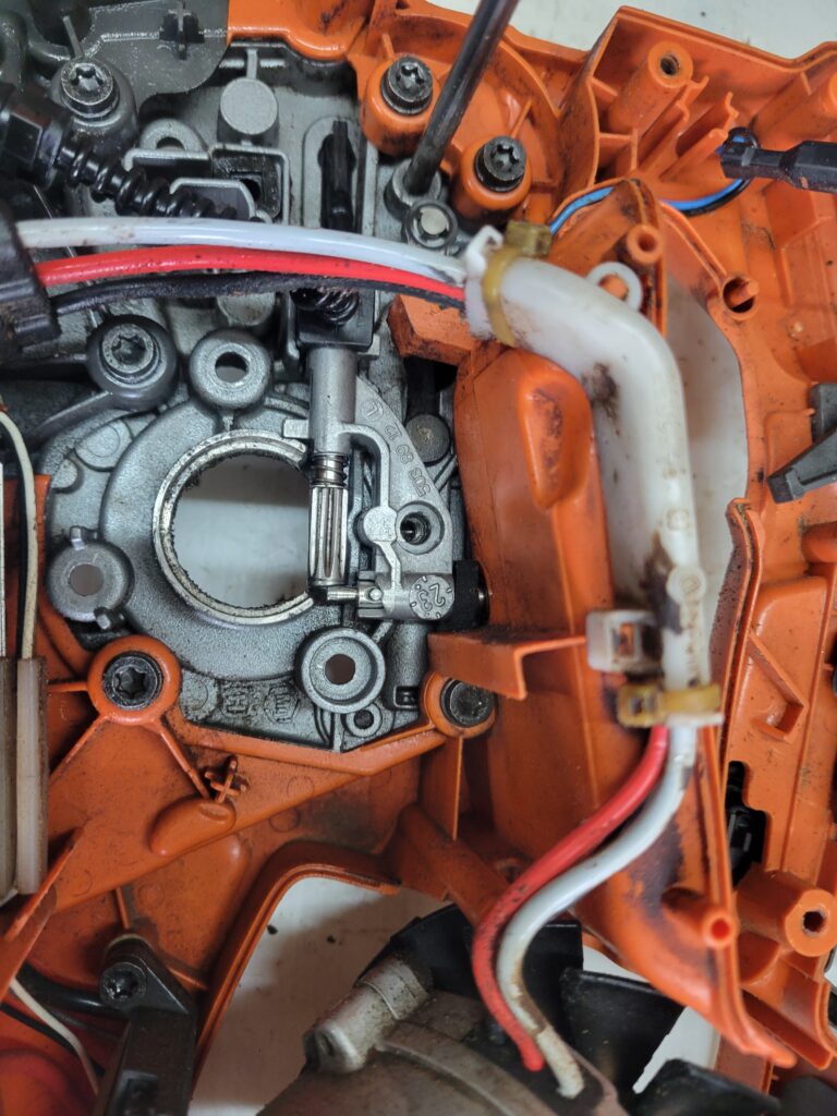 オイルポンプのギア部分がチェーンオイルで固着してしまい、ギア部分が回らない状態になっていました。