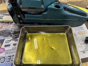 チェンオイルでした。ガソリンの匂いがしません。チェンソーを何台も持っているベテランでもたまに間違えてしまう人がいます。給油する前に確認してください。