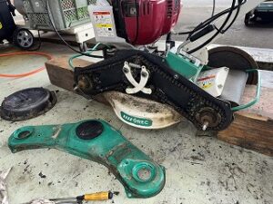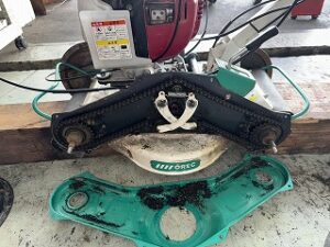 チェーンケースに草が詰まっていたので清掃、グリスアップしました。組み付けてブレーキワイヤー調整すると刈刃クラッチを入れて正常に走行しました。