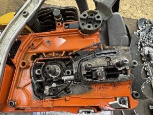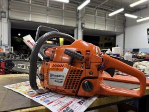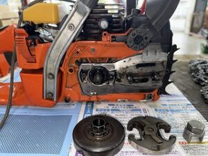 PLOW長岡店の柳です。Husqvarna346XPチェンオイルが漏れる症状で魚沼市のお客様から持ち込みされました。