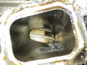 マフラーを外してみるとピストンに排気漏れした跡がありました。ピストンには縦傷なし