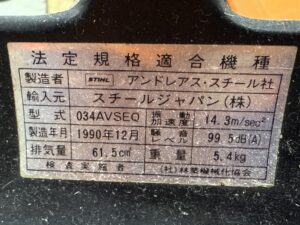 型式034AVSEQ 排気量61.5cm3 製造年月1990年12月なので35年前のチェンソーです。現行機種はMS400.1C-M 排気量62.6cm3