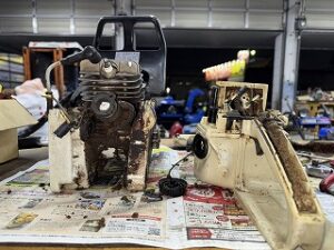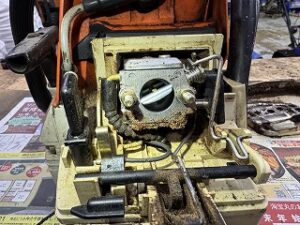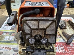 PLOW長岡店の柳です。STIHL 034AV SUPERタンクハウジング破損修理で津南町のお客様から持ち込みされました。