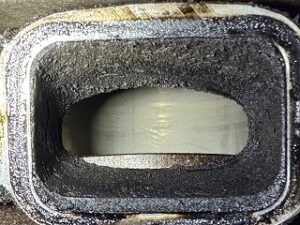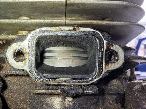 シリンダーの吸気側も縦傷なし、排気口に燃焼生成物が堆積しています。