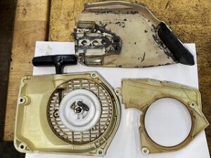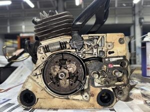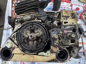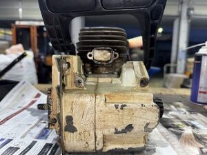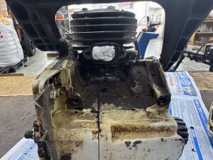 PLOW長岡店の柳です。STIHL 034AV SUPER(034AVSEQ)修理受注しました。部品発注して清掃開始します。マフラーを取り外しました。