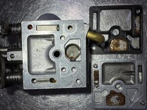 フィルターに木屑が詰まっています。燃料タンクに入った細かい木屑はピックアップボディを通過してキャブレターを詰まらせてエンジン不調原因になります。