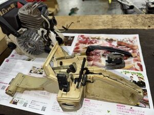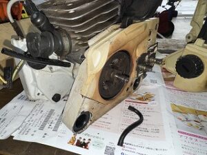 チェンオイル、燃料を補給してエンジン始動しました。チェンオイル吐出確認しました。次回はキャブレター調整して修理完了です。