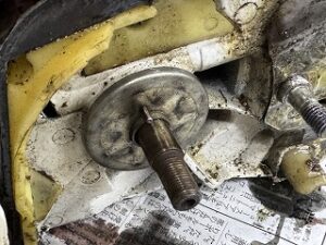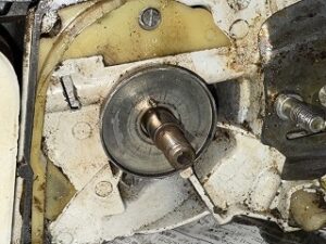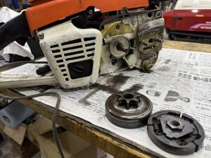 クラッチが固着してスターターを引くとソーチェーンも一緒に回ってしまうのでクラッチを点検します。