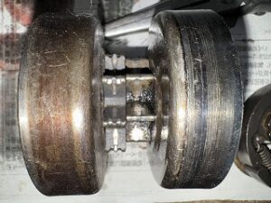 長岡店にストックしている041AVから取り外したスプロケット右とお客様の041AVのスプロケット左です。かなり厚さが違います。同じ厚さに削れば固着しなくなります。