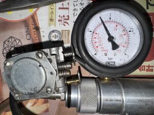 キャブレター漏れテストをすると0.8barから針が徐々に下がってしまいました。NGです。さらに高速Hスクリューが異常に締め込んであります。燃料漏れ+調整不良によるエンジン不調と診断します。