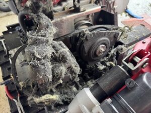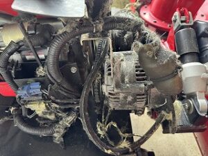 エンジンカバーを開けてみるとベルトが粉々になっています。