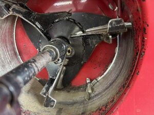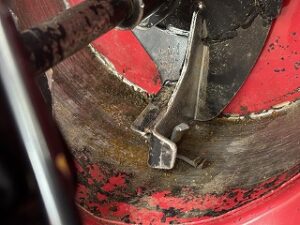 またしてもブロアーに金属片が挟まっています。ガッチリ食い込んでいています。オーガを左右外してからバールでこじってみると少し動いたのでハンマーで叩きながら少しずつシューター側に移動させると