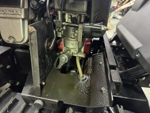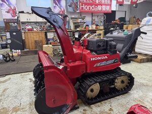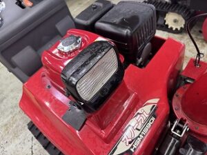 PLOW長岡店の柳です。ホンダHSM1590i オイル警告灯が点灯して補充したら噴き出したという症状で引き取りしました。警告灯が点灯した時、機体が右側に傾いていたそうです。エンジンオイルが規定量入っていても傾け過ぎるとオイルレベルセンサーが検知して警告灯が点灯します。