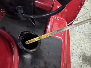 入れ過ぎています。抜いてみると2Lくらい入っていました。正しいエンジンオイルの点検、補充はエンジンを水平(オーガハウジングを接地)にしてから行ってください。