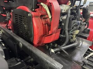 至るところにオイルが飛び散っています。まずは清掃してから他に不具合箇所がないか点検するとオーガベルトが摩耗限界でした。ベルトを交換して試運転すると