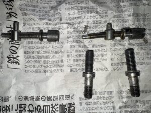 専用工具でスタッドボルトを抜き取りましたが、チェンアジャスティングスクリュー(右側)が曲がっています。スペアで持っていたスクリューも曲がっていて使い物にならないので裏技を使います。