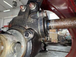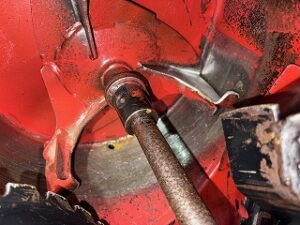 オーガミッションオイルが漏れているのでよく見るとブロアーシャフトに青いビニールを巻き込んでいました。見積もりしてGOサイン頂きましたので修理開始します。