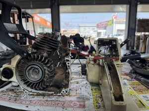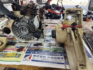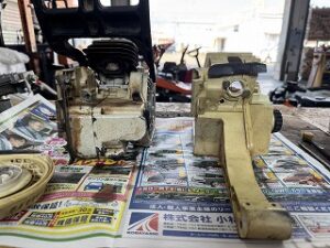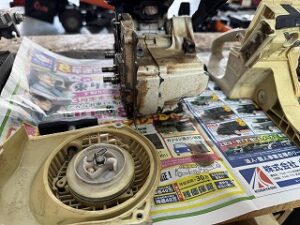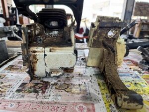 PLOW長岡店の柳です。STIHL 026修理受注しました。機体清掃を開始します。エンジンとタンクハウジングを分離しました。