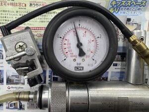 インレットニードルバルブ、メタリングダイヤフラム、ポンプダイヤフラム、ガスケット交換して組み付けたらポンプを使って漏れテストをします。0.8barを維持しています。正常なことを確認しました。