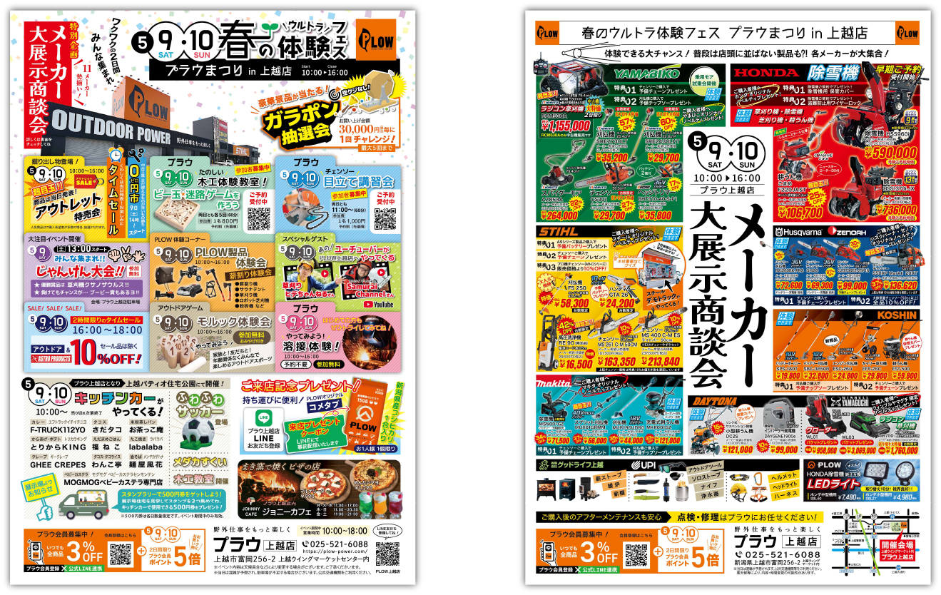 屋外作業をもっと楽しくするお店「PLOW(プラウ)」上越店では、5月9日(土)と10日(日)の2日間、恒例の春イベント『春のウルトラ体験フェス プラウまつり in 上越店』を開催いたします。